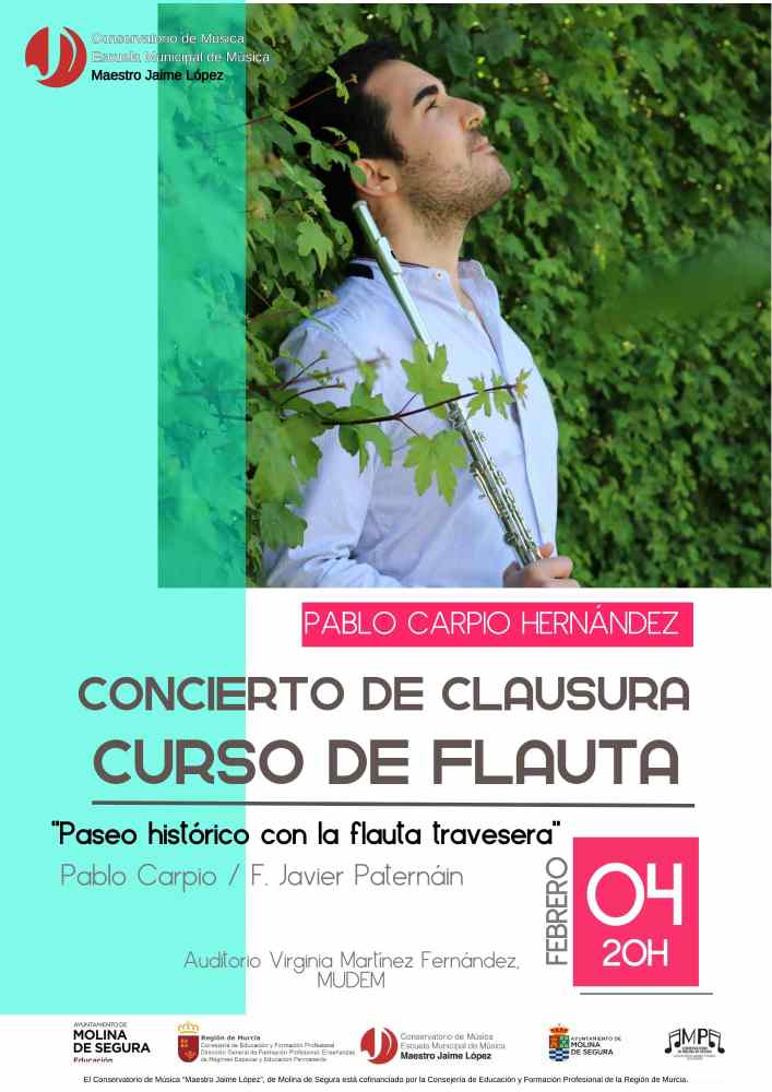 El Conservatorio de Música Maestro Jaime López de Molina de Segura, en colaboración con la Asociación de Madres y Padres del centro, organiza un curso de flauta travesera los días 3 y 4 de febrero de 2025. La formación estará a cargo del reconocido flautista murciano Pablo Carpio Hernández y está dirigida al alumnado de Enseñanzas Profesionales de Música, en la especialidad de flauta travesera. Las sesiones se llevarán a cabo en el Auditorio Virginia Martínez Fernández, situado en el MUDEM.