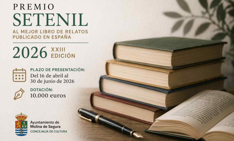 El Ayuntamiento de Molina de Segura ha convocado el XXIII Premio Setenil 2026 al Mejor Libro de Relatos Publicado en España, un galardón que cuenta ya con 23 años de trayectoria y está dotado con 10.000 euros para el autor ganador. El plazo de presentación de obras está abierto desde el 16 de abril hasta el 30 de junio de 2026.