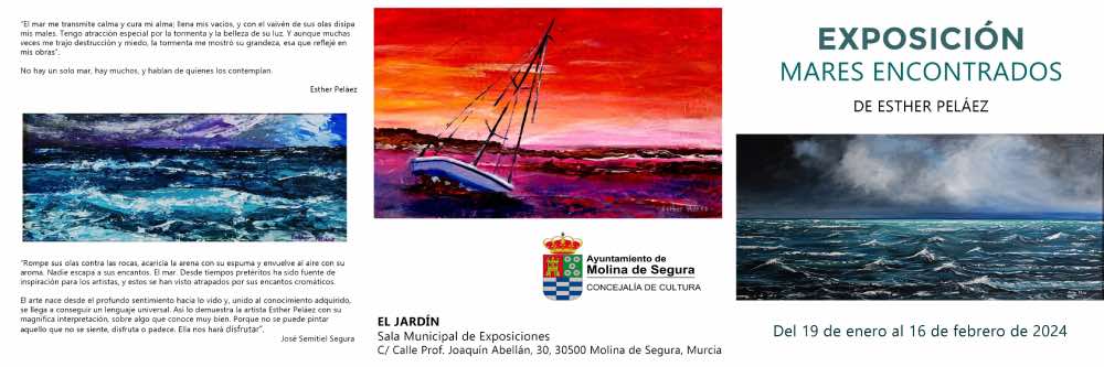 La exposición MARES ENCONTRADOS, de la artista Esther Peláez, organizada por la Concejalía de Cultura del Ayuntamiento de Molina de Segura, abre sus puertas al público el viernes 19 de enero, en la Sala Municipal de Exposiciones El Jardín (en Calle Profesor Joaquín Abellán, nº 8). La concejala de Cultura, María Hernández, asiste a la inauguración de la exposición junto a la artista, a las 20.00 horas.