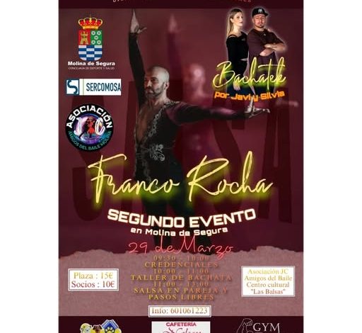 La Asociación de Baile de Molina anuncia la celebración del Segundo Evento Nacional de Baile en Molina de Segura, que contará con la participación destacada del maestro Franco Rocha, bicampeón mundial e instructor internacional de ritmos latinos.