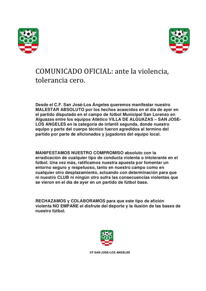 Con el pitido final, dolidos por la derrota, diversos jugadores locales fueron a engancharse con los de la escuela San José Los Ángeles. En el partido de la ida ya había habido piques. El delegado del equipo de Molina intentó mediar, y sería el peor parado, cuando hasta quince personas, de forma cobarde, lo ajusticiaron dándole una paliza, en presencia de su mujer y sus dos hijos (uno de ellos también agredido) con una vergonzosa falta de humanidad que se pudo vivir en el San Lorenzo.
