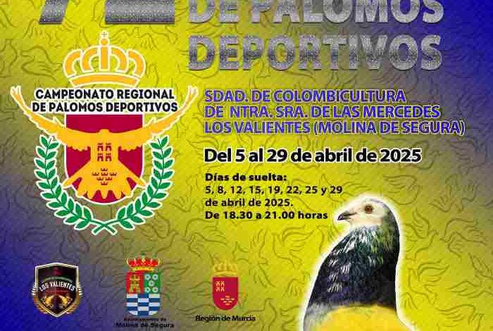 La pedanía de Los Valientes, en Molina de Segura, será sede del 72º Campeonato Regional de Palomos Deportivos, que se celebrará entre el 5 y el 29 de abril de 2025. El evento, que reúne a 100 palomos clasificados en campeonatos intercomarcales, constituye la competición de palomos más relevante de la Región de Murcia y es clasificatoria para el Campeonato de España.