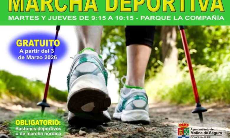 El Ayuntamiento de Molina de Segura, a través de la Concejalía de Deporte y Salud, ha anunciado la puesta en marcha de la nueva actividad gratuita “Marcha Deportiva” en Molina de Segura, que comenzará el 3 de marzo de 2026 y se realizará dos días por semana.
