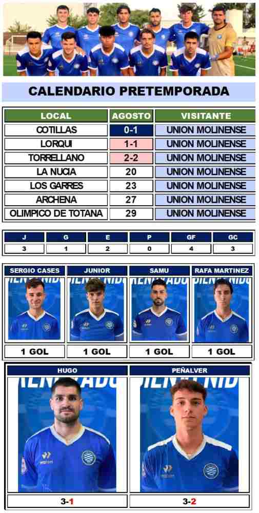 Semana de trabajo altamente competitiva en la pretemporada de la Unión Molinense, en una semana donde disputó hasta dos amistosos, el primero el lunes en el feudo del Lorquí (1-1), para que el miércoles hiciera lo propio en tierras ilicitanas ante el Torrellano (2-2), firmando ambos encuentros con empate, que unido a la victoria en casa del Cotillas (0-1) le mantienen como invicto en pretemporada.