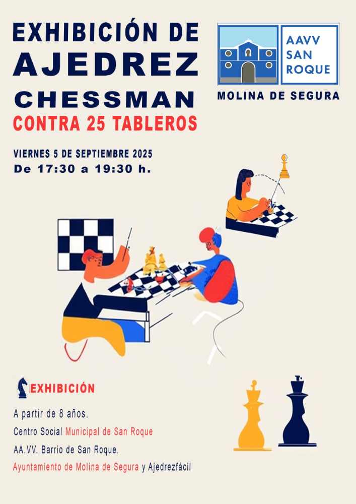 - 17:30 h – Exhibición de ajedrez Chessman contra 25 tableros.