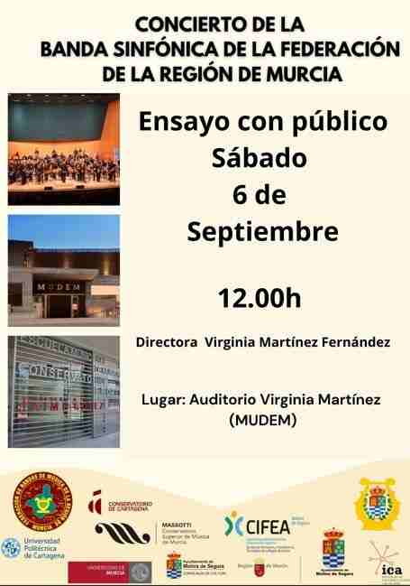 📍 Recorrido: Plaza de España, Paseo Rosales y mercado del Parque de la Compañía. - 12:00 · Ensayo público de la Banda Sinfónica de la Federación de Bandas de Música de la Región de Murcia, dirigida por Virginia Martínez Fernández.