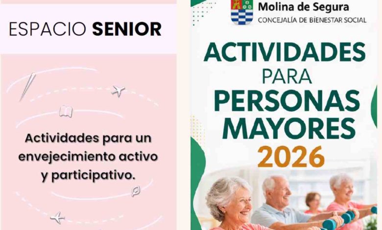 Molina de Segura pondrá en marcha en 2026 una nueva oferta de actividades para personas mayores en Molina de Segura con dos líneas de trabajo: el programa Espacio Senior y el proyecto de Dinamización de Asociaciones de Personas Mayores. La programación está dirigida a vecinos de más de 65 años e incluye talleres, ejercicio físico, actividades culturales y propuestas de participación social.