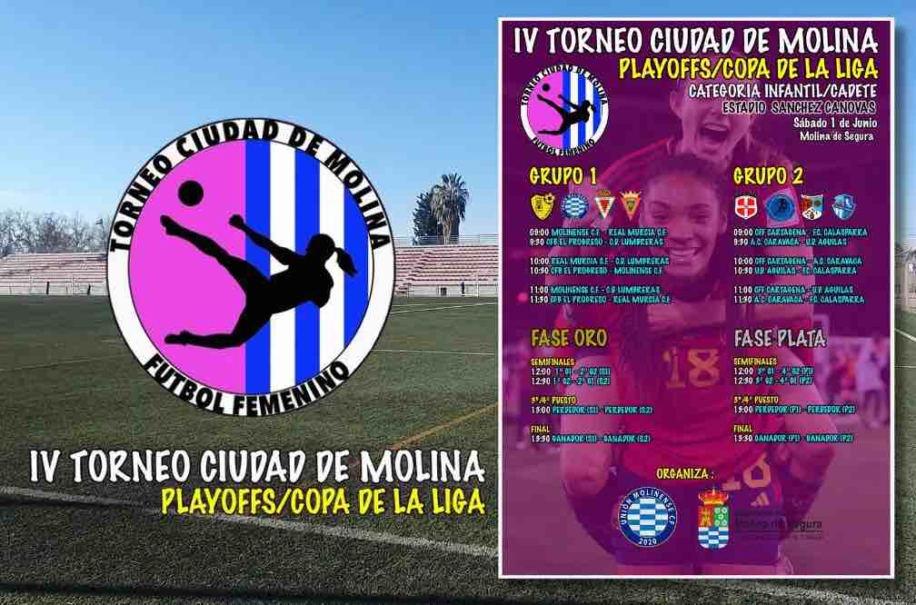 Sábado 1 de junio, de 09:00 a 15:00 horas. El Unión Molinense CF y el Ayuntamiento de Molina de Segura, han organizado, en el Estadio Municipal Sánchez Cánovas, el IV Toreno de Fútbol Femenino Ciudad de Molina, en el que se jugarán los partidos del Play Off correspondiente a la Copa de la Liga Femenina categorías Infantil/Cadetes.