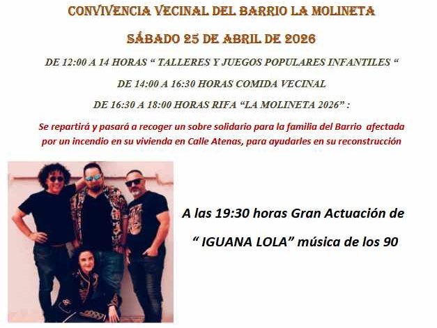 La tarde seguirá con la rifa “La Molineta 2026”, programada entre las 16:30 y las 18:00 horas. Ya por la noche, a las 19:30 horas, está anunciada la actuación de Iguana Lola, con música de los años 90 para cerrar la jornada.