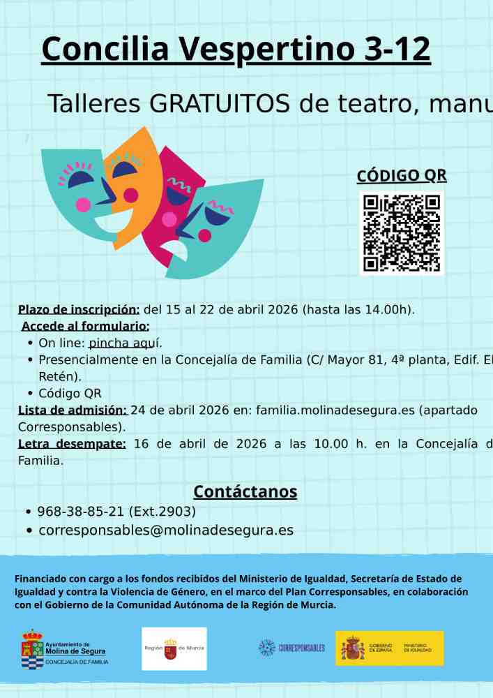 La Concejalía de Familia informa que, del 15 al 22 de abril, las familias pueden pedir plaza en los programas de conciliación en Molina de Segura denominados «Corresponsables hasta 16» y «Concilia Vespertino 3-12». Ambos proyectos están financiados por el Ministerio de Igualdad, a través de la Secretaría de Estado de Igualdad y contra la Violencia de Género, en colaboración con el Gobierno de la Región de Murcia. Su objetivo es ofrecer espacios de respiro familiar y facilitar el cuidado de los hijos.