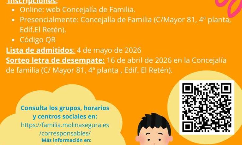 Las solicitudes para ambos programas pueden presentarse a través de la web familia.molinadesegura.es, mediante código QR o de forma presencial en la Concejalía de Familia, situada en Calle Mayor, 81, 4.ª planta, Edificio El Retén.
