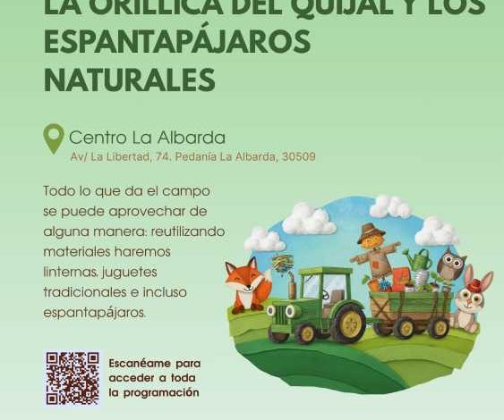 El próximo domingo 2 de noviembre, de 11:30 a 13:30 horas, se celebrará en el Centro de Interpretación La Albarda, en Molina de Segura, la actividad La Orillica del Quijal y los Espantapájaros Naturales, una propuesta organizada por la Concejalía de Turismo del Ayuntamiento.
