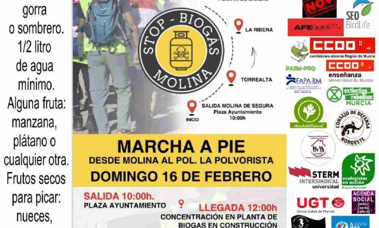 «Ante la falta de respuesta formal por parte del alcalde de Molina de Segura sobre la posible revisión de oficio del expediente de la planta del polígono industrial La Polvorista, la plataforma ha convocado una marcha a pie para el próximo 16 de febrero desde la plaza del Ayuntamiento hasta la planta de biogás, que pasará por varios núcleos poblacionales afectados y a la que invitan a sumarse a todos los murcianos.