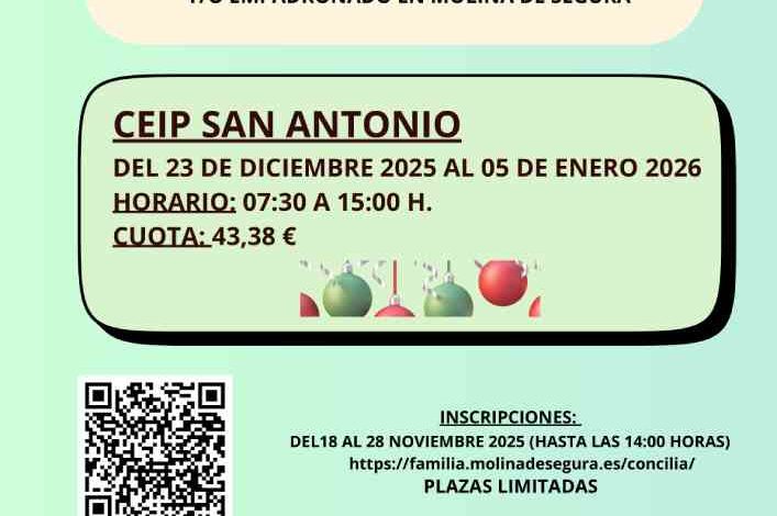 📌 El plazo de solicitud es el mismo: del 18 al 28 de noviembre, hasta las 14:00 horas. El trámite puede hacerse online a través de la web familia.molinadesegura.es/concilia, o presencialmente para quienes no dispongan de medios técnicos.