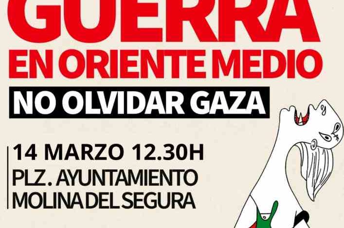 En Molina de Segura, la concentración está prevista para el 14 de marzo a las 12.30 horas en la plaza del Ayuntamiento. La cita se enmarca en esta jornada estatal de movilización por la paz en Oriente Medio.