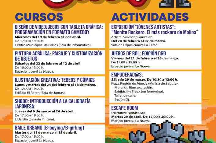 Las actividades y cursos se llevarán a cabo de lunes a viernes en horario de tarde y los sábados por la mañana, con el objetivo, de acuerdo con la información proporcionada por la concejalía, de ofrecer un espacio de aprendizaje y entretenimiento accesible para los jóvenes en diferentes franjas horarias. El concejal de Juventud, Pablo García, ha señalado que “con esta programación seguimos apostando por los jóvenes de Molina de Segura. Estamos mejorando tanto la cantidad como la calidad de las actividades, lo que se refleja en una respuesta positiva sin precedentes por parte de los propios jóvenes”.