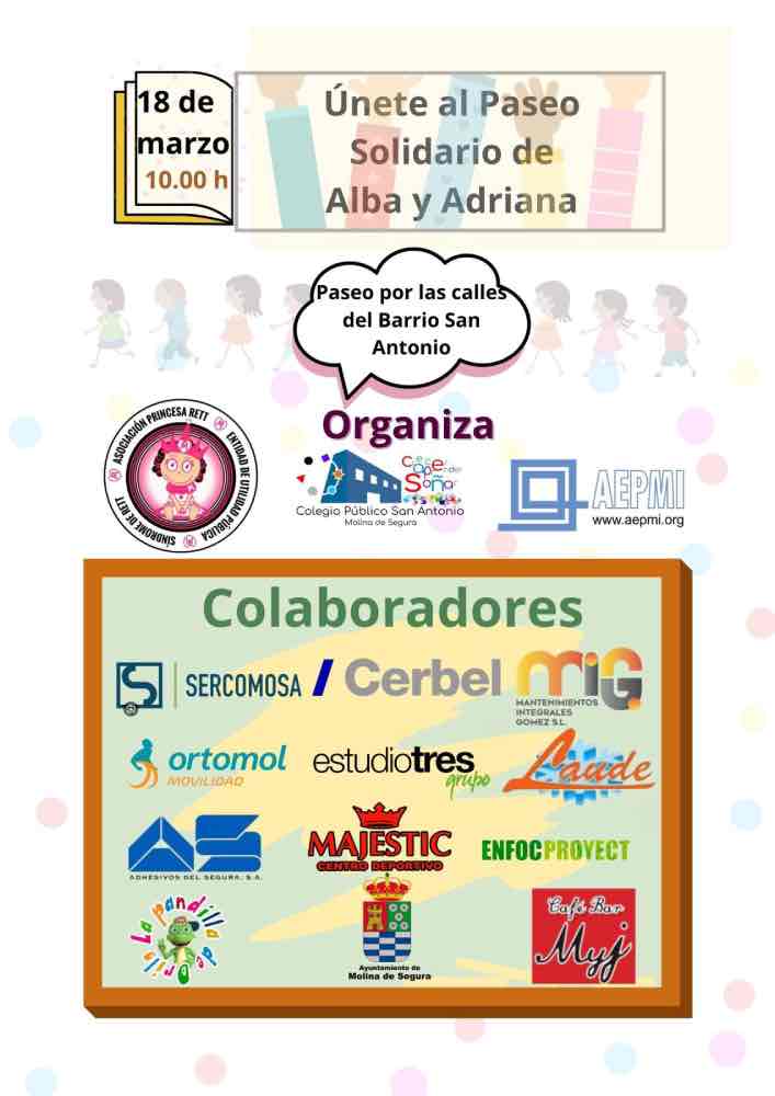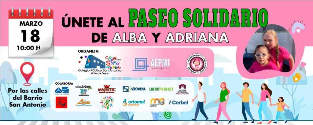 En un gesto de solidaridad y compromiso comunitario, el CEIP San Antonio de Molina de Segura se prepara para celebrar un paseo solidario el próximo 18 de marzo de 2024. Este evento no es solo una manifestación de apoyo, sino un llamado a la acción para ayudar a Alba y Adriana, dos valientes alumnas del colegio que luchan contra enfermedades raras: el Síndrome de Leigh y el Síndrome de Rett, respectivamente.