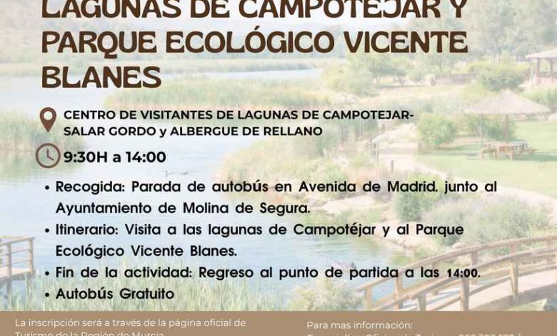 La visita guiada gratuita en Molina de Segura para conocer Las Lagunas de Campotéjar y el Parque Ecológico Vicente Blanes se celebrará el domingo 19 de abril. La salida será a las 09.30 horas desde la parada de la Avenida de Madrid, junto al Ayuntamiento, y el regreso al casco urbano está previsto para las 14.00 horas.
